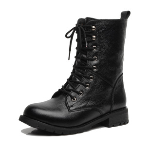 溫州廠家 頭層牛皮韓版時(shí)尚中筒馬丁靴 男女騎士系帶粗跟秋冬女靴