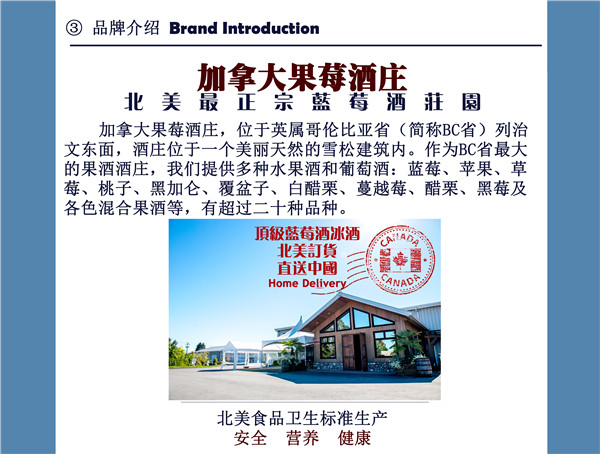 加拿大果莓(原名珊杜詩(shī)酒莊)位于英屬哥倫比亞省(簡(jiǎn) 稱BC省)列治文東面。酒莊坐落在一個(gè)美麗天然的雪松 建筑內(nèi),是BC省富饒農(nóng)地的中心地帶。作為BC省The bigest的 果酒酒莊,我們提供多種水果酒和葡萄酒:藍(lán)莓、蘋果、 桃子、黑加侖、覆盆子、白醋栗、蔓越莓、醋栗、黑莓及 各色混合果酒等,有超過(guò)二十種品種。 我們的葡萄酒來(lái)自BC省的奧肯那根山谷,其他所有的果 莓水果都直接來(lái)自菲沙河谷及我們酒莊自帶的藍(lán)莓農(nóng)場(chǎng)。 我們屢獲獎(jiǎng)項(xiàng)的釀酒師致力生產(chǎn)the best的果莓酒。我們美 味且搭配均勻的餐酒和餐后甜酒都予以見(jiàn)證,我們真誠(chéng)地 邀請(qǐng)您參觀我們的品酒屋,來(lái)酒莊親身體會(huì)。