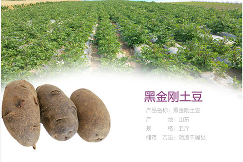 黑金剛土豆屬中早熟型,從播種到成熟生育日數為90天,株型直立,株高60-65厘米左右,花紫色,深藍紫色花冠,花期長,自然結實,塊莖長橢圓形,深紫皮、深紫肉,無雜色,單個薯塊重約200克左右,芽眼淺,結薯集中,耐貯運,植株高抗早晚疫病、病毒病,休眠期短。宜采用壟作點播方式種植,株距20-25厘米。行(壟)距65厘米,畝用種100公斤左右,適宜種植密度5500-6500株/畝,產量約2000-2500公斤/畝,高產優質田每畝可達3000公斤。