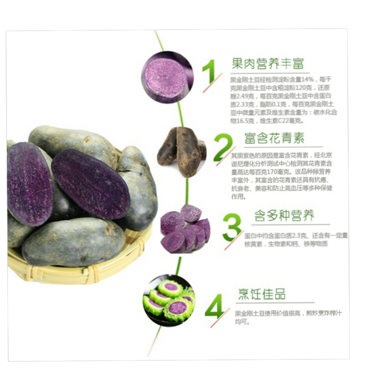 黑土豆花青素含量48.4mg∕100g鮮薯、抗氧化活性物質高于一般品種,有延緩衰老等作用。適于大棚等保護地栽培。