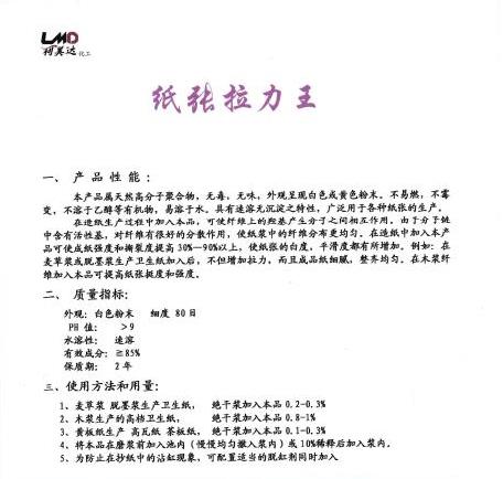 在造紙生產過程中加入本品,可使纖維上的羥基產生分子之間相互作用。由于分子鏈中含有活性基,對纖維有很好的分散作用,使紙漿中的纖維分布更均勻。在造紙中加入本產品可使成紙強度和撕裂度提高30%—90%以上,使紙張的白度,平滑度都有所增加。例如:在麥草漿或脫墨漿生產衛生紙加入后,不但增加拉力,而且成品紙細膩,整齊均勻。在木漿纖維加入本品可提高紙張挺度和強度。